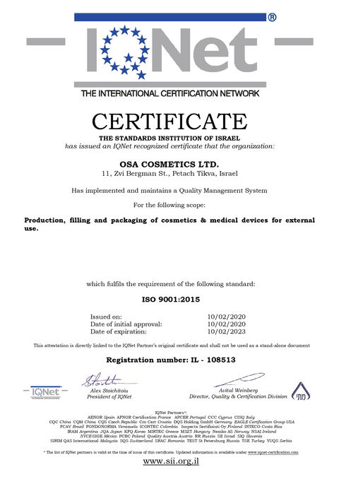 The Israeli Ministry of Health constantly monitors the operation of the laboratory. All manufactured products have the necessary certificates and permits issued by the Israeli Ministry of Health and the products comply with international quality standards.